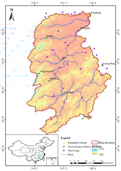 Ganjiang River, with total length of 766 km, is the seventh largest tributary of Yangtze River and also the longest river in Jiangxi province of China. The Ganjiang River Basin (GRB), located within 113°30′~116°40′ E and 24°29′~29°21′ N, covers a total drainage area of 80,948 km2 above Waizhou hydrological station and accounts for 51% of the area of Jiangxi province in the southeast of China (Figure 1). The topography of GRB varies from hills in the southern region to alluvial plains in the northeastern region, with elevation ranging from 105 m below the sea level to 2128 m above the sea level.