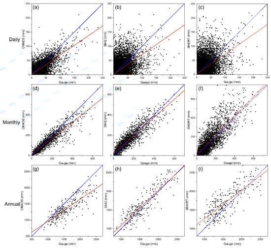 Scatterplots of precipitation comparison at selected pixels with rain gauges for CMADS (left column), 3B42 (middle column) and 3B42RT (right column) in the GRB: (a–c) at the daily time scale, (d–f) at the monthly time scale and (g–i) at the annual time scale. The diagonal line is blue, and the best-fit line estimated by the OLS (ordinary least square) method is red.
