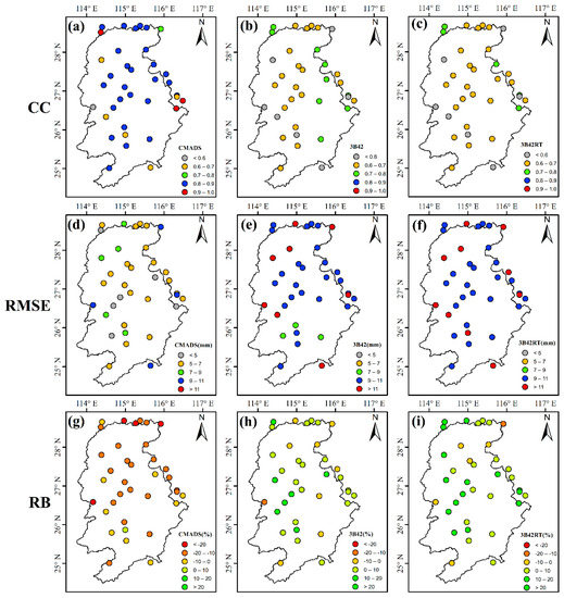 Spatial distribution of statistical metrics at selected pixels with rain gauges for CMADS (left column), 3B42 (middle column) and 3B42 RT (right column) in the GRB: (a–c) CC, (d–f) RMSE and (g–i) RB.