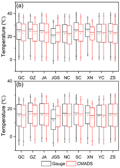 Box plots of temperature estimated from meteorological gauges and CMADS in the GRB for (a) daily maximum temperature and (b) daily minimum temperature (GC: Guangchang; GZ: Ganzhou; JA: Jian; JGS: Jianggangshan; NC: Nanchang; SC: Suichuan; XN: Xunnian; YC: Yichun; ZS: Zhangshu, shown in Figure 1).