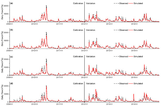 Comparison of daily observed streamflow with SWAT-simulated streamflow driven by (a) Obs + Obs, (b) CMADS + Obs, (c) 3B42 + Obs and (d) 3B42RT + Obs input scenarios, respectively.