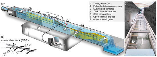 - Flügel, D.; Bös, T.; Peter, A. Forschungsprojekt: Massnahmen zur Gewährleistung eines Schonenden Fischabstiegs an Grösseren Mitteleuropäischen Flusskraftwerken—Ethohydraulische Untersuchungen zum Fischabstieg Entlang eines Vertikalen, Schräg Ausgerichteten Fischleitrechens (Investigation on Downstream Fish Migration along Vertical, Angled Fish Guidance Screens—Ethohydraulic Investigations in a Laboratory Flume); Technical Report; Swiss Federal Institute of Aquatic Science and Technology (Eawag): Dübendorf, Switzerland, 2015. (In German) [Google Scholar]