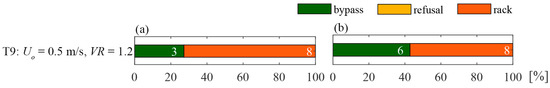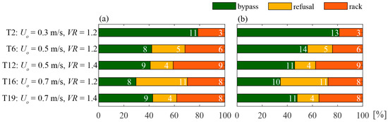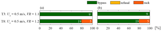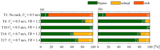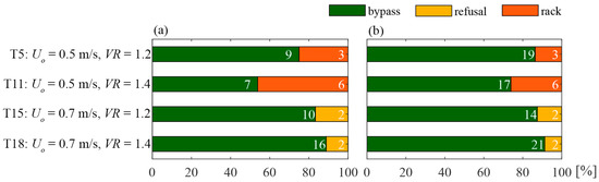 - In the tested range (0.5–0.7 m/s), the approach flow velocity Uo did not have a significant effect on the fish guidance efficiency. It significantly affected the refusal and the rack passage rates, however. Increasing Uo from 0.5–0.7 m/s significantly increased the number of refusals and significantly decreased the number of rack passages. This result suggests that the higher velocity and pressure gradients near and between the bars of the CBR at Uo = 0.7 m/s compared to Uo = 0.5 m/s lead to an increased behavioral barrier effect.