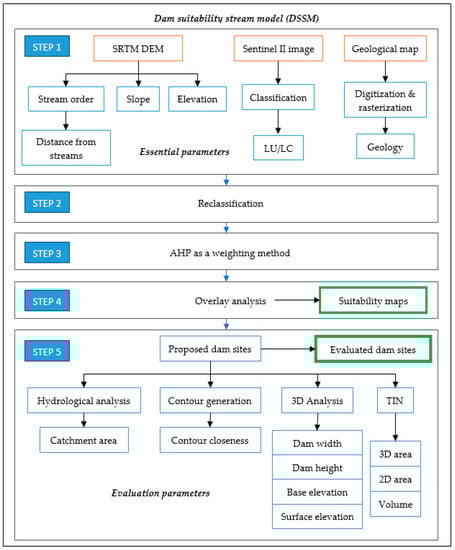 Previously many techniques have been applied to find potential sites for dams: multi-purpose earth dam sites use AHP []; GIS, which included overlay, polygon intersection, and normalized cumulative weighted index (NCWI) []; GIS spatial analysis for a valley by analyzing its shape, geometrical and bathometric properties []; a geo-spatial information system for small hydropower []; automation of the hydropower site identification process using a GIS-based computational program based on remote sensing and regional streamflow data []; assessment of small dam sites’ suitability based on satellite, climatological, and hydrological freely available data []; dam spots for flood control based on remote sensing (RS) and GIS []. Locating reservoirs with GIS and RS, where two models, Boolean and weighted linear combination (WLC), were comparatively evaluated [].