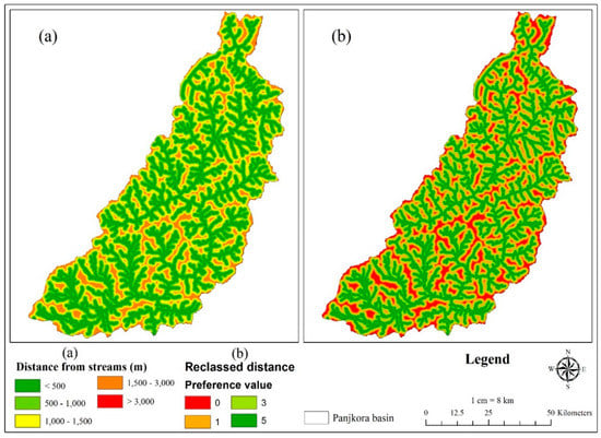 A watershed modeling approach was applied in a GIS environment by using SRTM DEM [] to delineate the Panjkora River Basin. Strahler’s law [] defined the stream order and we extracted the drainage network of the Panjkora Basin. Likewise, the slope map generated from DEM in the ArcGIS (Environmental Systems Research Institute (ESRI) located in Redlands, CA, USA) environment, and the slope’s degree, was classified into five classes [,]. DEM itself is considered as an elevation layer, which is organized into five classes. The satellite image is processed and classified by using a supervised image classification approach in ENVI 4.8. A land-use/land-cover (LULC) map is prepared in five classes, including water bodies, agricultural land, barren land, forest cover, and settlements []. The geological map is digitized and then saved as raster layers []. All the above criteria layers are shown in Figure 3. Moreover, the Euclidean distance tool in ArcGIS is used to build distance zones from Streams, and the layer, later on, is used instead of stream order itself. The Euclidean distance layer is named as the reciprocal parameter of stream order. (Figure 4). Each criterion’s classification is based on the literature [,] and expert opinions (Geologists, GIS experts, Geographers).