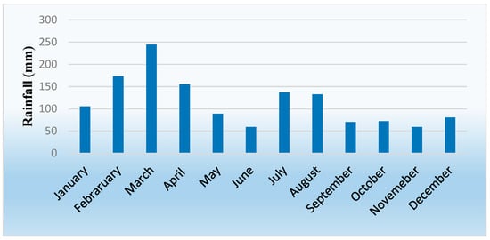 Average monthly rainfall data of 30 years from 1981 to 2010 are analyzed, and obtained from the Dir and Timergara met stations. The winter rainfall source is western depression, whereas Monsoon winds are the primary source of rainfall in summer. Rainfall is more prominent in winter than in summer. Similarly, the study area receives more rain in March, 234 mm upstream, and 244 mm in downstream areas (Figure 6 and Figure 7).