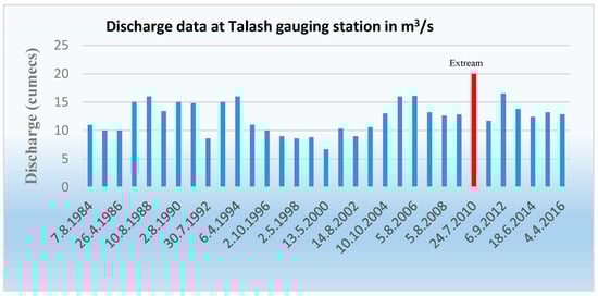 The highest discharges of the Panjkora River were recorded at the Talash gauge station for 30 years from 1985 to 2015 (Figure 8). The results reveal that ever highest discharge was recorded in July 2010. This highest peak shows disastrous 2010-flood due to the 4-day wet spell (27–30 July), where a massive quantity of fresh water was lost, causing damage and could not be stored for future use due to lack of dams. Similarly, each year even in normal conditions, rain-water and melt-water have been losing. Moreover, antecedent rainfall influences slope stability, which also causes landslides []. Therefore, building a multi-purpose dam is needed to store water.