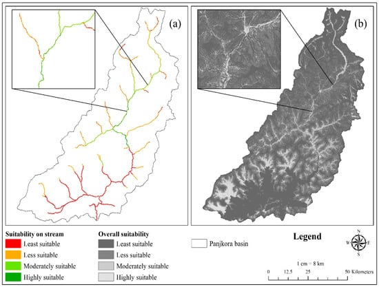 Suitability maps: (a) suitability on stream (b) overall suitability.