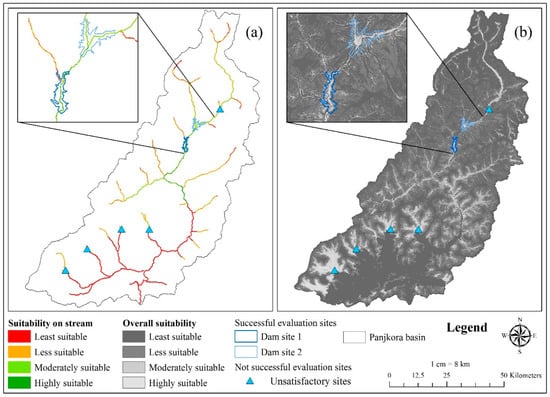 Proposed dam sites (a) dam sites with suitability on stream (b) dam sites with overall suitability.