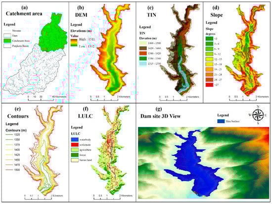 Evaluation parameters for Dam site 1: (a) catchment area (b) elevation (c) triangulated irregular network (TIN) (d) slope (e) contours (f) LULC (g) 3D view.