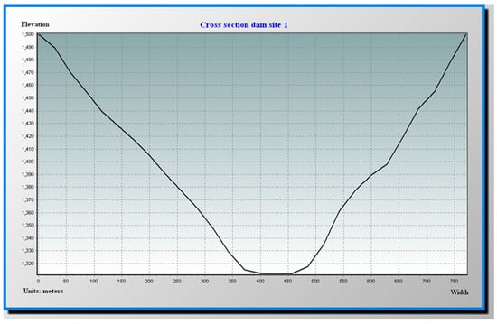 The proposed sites are evaluated based on the parameters listed in Table 7, and their visualized form is shown in figures (Figure 12, Figure 13, Figure 14 and Figure 15). In Table 7, the values of the essential parameters are also shown for both the proposed dam sites. Site 1 is on the stream of the larger highest order (stream order 5), which also has a larger catchment area (Figure 12) as compared to site 2 where the stream order is 4 (Figure 14). Volumetrically, site 2 is more extensive, which is also economically more suitable for constructing the dam wall as a cross-section (Figure 15) showing less width than site 2 (Figure 13). Site 1 lies in the moderate zone of geology, where metasedimentary rock exists (Dir metasediments). Dir metasediments are mostly composed of slates but are strong enough to resist the water from percolation. Site 2 lies in the high zone of geology consisting of volcanic rocks.