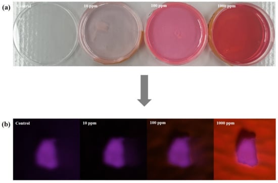 To maximize the capability of the NR-P method in MP analysis, various concentrations of NR solution (0, 10, 100, and 1000 ppm) were applied to the plates and assessed. The plates colored with NR solution showed an increasing red color intensity as the concentration of NR solution rose, as expected (Figure 1a). While the MPs were observed as slightly blurry in the MP boundary at 10 and 100 ppm, the highest concentration (1000 ppm) showed the clearest MPs (Figure 1b). Therefore, all subsequent experiments used 1000 ppm when the NR-P method was applied.