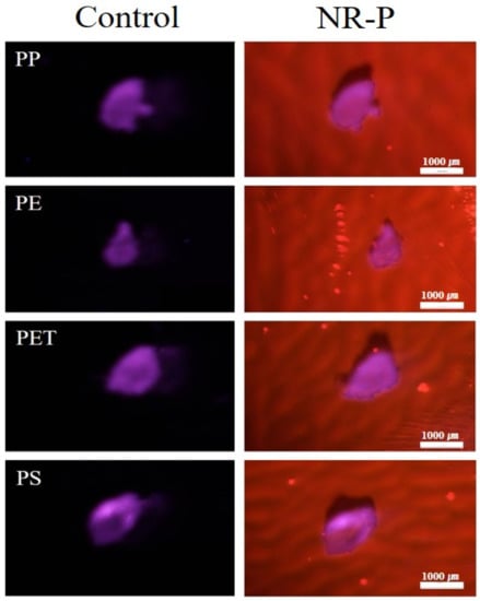 The performance of the NR-P method for the MP observation was assessed using different types of polymers (PP, PE, PET, and PS (100% purity)) with an average size of 300–500 µm (Figure 2). The NR-P method showed a clearer resolution of all types of MPs assessed than the control, for which the plate was not colored. Thus, no impact of MP type on their luminescence was observed with the NR-P method.