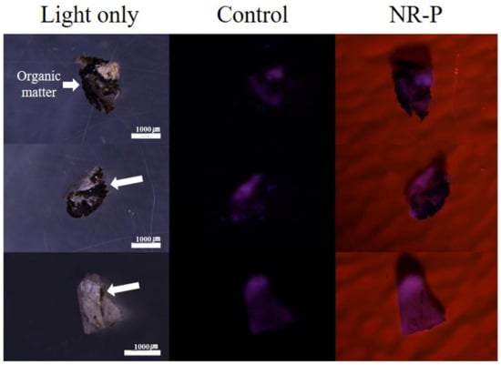 However, we expected that the obscured MPs may not be clearly observed with the NR-P method, considering that this method requires that the NR solution coated on the plate should be passed through MPs to luminate them. Additionally, given that Erni-Cassola et al. [] showed that 20–1 mm MPs were effectively observed with the NR-S method, along with fluorescence microscopy, further research is required for the observation of MPs smaller than 100 µm with the NR-P method.