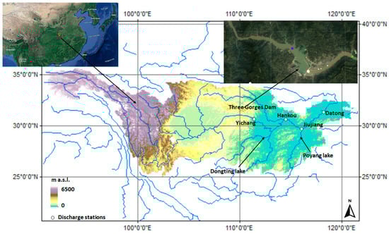 The Yangtze River, the longest river in Asia, originates on the Qinghai-Tibet Plateau at 5100 m above sea level, spanning 6300 km eastward before flowing into the East China Sea (Figure 1). The whole river basin spans for 1,722,115 km2 and it is conventionally subdivided into three sub-basins: the upper one, where the river flows in mountain areas with a steep river channel from the spring to Yichang, the middle one from Yichang to Hankou, and the lower basin from Hankou to the estuary [,,,,]. Rainfall in the Yangtze Basin follows a typical monsoonal regime [], with more than 60% of annual precipitation falling during the wet season between June and July [,]. The annual areal precipitation ranges from 859 mm in the upper reach to 1528 mm in the lower reach [].