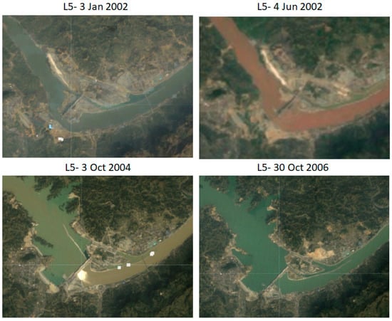 Examples of Landsat 5 images (3 January 2002, 4 June 2002, 3 October 2004, 30 October2006) showing the differences in Three Gorges Dam building and functioning.