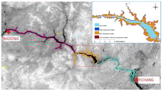 To deal with adjacency effect and to further refine the geometry of the mask, the river banks from the city of Badong to the city of Yichang are digitized with a spatial resolution of 5 m on Google Earth™. The superimposition of the two rasters upon the NIR masks of the various years allows to extract exclusively the permanently submerged pixels, creating new water masks subsequently rescaled at 250 m. The masks are then further refined with manual checks (i.e., a few pixels just downstream of the TGD are excluded, due to the constant presence of whitecap generated by the dam’s spillways) and the MODIS reflectance dataset is then masked using the rescaled water masks at 250 m. In Figure 3, the extracted water area is reported, with a focus on the Three Gorges Dam reservoir, highlighting the pixels characterized by the perennial presence of water and not affected by adjacency effects.