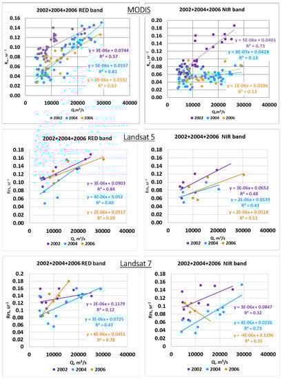 For Landsat 7, a high correlation is observed just in 2006 for RED band (R2 = 0.78) and in 2004 for the NIR band (R2 = 0.73). In 2004, the multiple reflectance values of the RED band do not show linear correlation with discharge values inferior to 10,000 m3/s, giving an overall R2 = 0.47, while in 2006, the linearity of the RED band reflectance with discharge is suggested by R2 = 0.78. The different accuracy of the relationship between the reflectances from different satellites and discharge data may be mainly due to the number of available images each year (e.g., satellite temporal resolution).