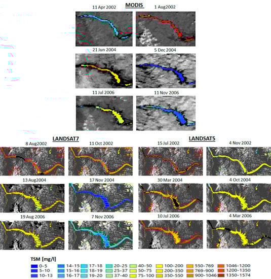 In Figure 5, TSM maps from MODIS and Landsat 5 and 7 are depicted, showing its spatial distribution in different representative periods of the year (e.g., flood and dry periods): the lowest values are always located in the reservoir, due to the sedimentation induced by the dam; the highest values are registered during summer, with monsoonal rains.