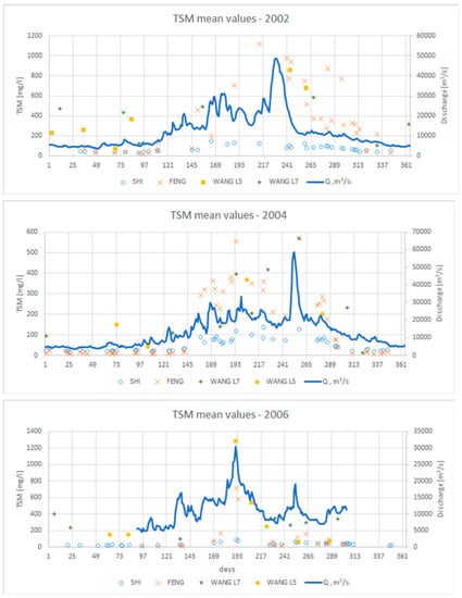 Daily TSM mean area values are then plotted against the in-situ daily discharge values at Yichang station to examine daily relative variations (in Figure 6) for the three satellites estimates. The most immediate outcome is that discharge in 2006 is significantly lower, and for every year any major discharge peak is followed by increments of TSM mean values, while a decrease in TSM and discharge is observed at basin scale. Moreover, is interesting to note that, even for the lowest discharge values (~5000 m3/s), TSM mean values never drop below 30 mg/L. TSM increases after each discharge peak. For MODIS, the Feng 2014 algorithm seems to be able to reproduce to discharge dynamic, on the contrary to the MODIS-Shi algorithm [] due to the problems the saturation for MODIS reflectances corresponding to 50 mg/L and beyond. Landsat 5 and 7 are both able to follow the discharge dynamic, with a similar behavior to MODIS data.