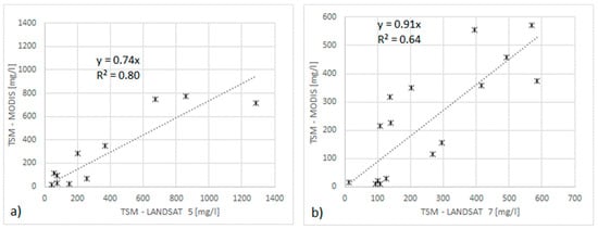 Comparison between TSM estimates from MODIS and Landsat 5 (a) and 7 (b) for the same dates.