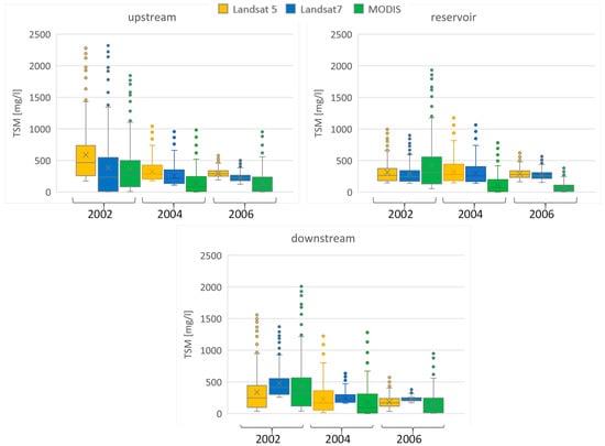 To better understand TSM variability in space and time, a Box-plot comparison of TSM estimates from the MODIS-Feng algorithm by [] and the Landsat 5 and 7 for the different years and areas of interest is shown in Figure 8. In general, all estimates are able to trace the decrease in the TSM from 2002 to 2006 in the three sub-areas examined. The statistics also highlight the small number of Landsat data with respect to MODIS data, as well as a high number of outliers and the relative abundance of data for 2002 compared to other years. Mean upstream TSM values decrease ofabout 200 mg/L, while downstream values decrease of about100 mg/L. Interestingly, the lake sub-area presents the highest TSM value of in 2002, while during the years following the TGD operational activity the same area shows the lowest value. Similar statistical values (mean, median, max, and min) are of the same order of magnitude for the different satellites in the same year and same area of analysis.