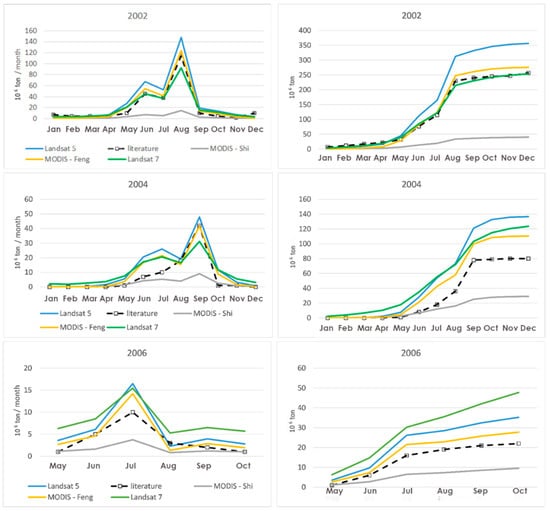 Literature values of monthly sediment discharge from [,,,,] are compared with the daily satellite continuous estimates obtained from the relationships in Table 2. In Figure 9, monthly sediment discharge values in millions of tons are reported at Yichang station for 2002, 2004, and 2006 for the three satellites.