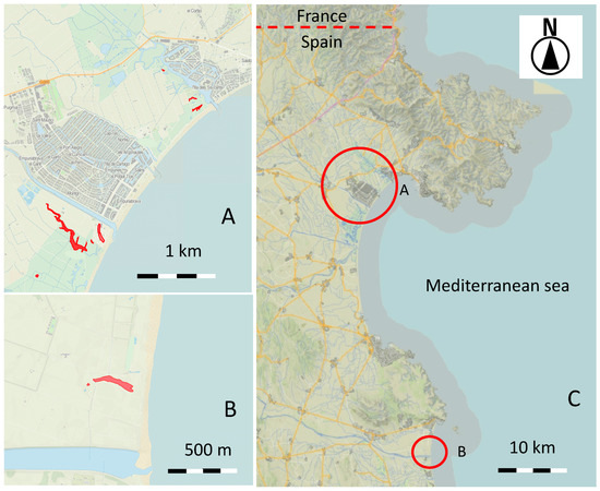 Location of the study region: Empordà coastal wetlands (Ter River Basin in the NE of the Iberian Peninsula) (C), with the detailed geographical position on the studied ponds in red (A,B). Eight of the studied ponds were located in the “Aiguamolls de l’Empordà” Natural Park (A), and two were located south in the “El Montgrí, Illes Medes i el Baix Ter” Natural Park (B). This map was produced with the online software ArcGIS (version 10.5.1, 2017, ESRI Environmental System Research Institute, Redlands, CA, USA) (https://www.arcgis.com).