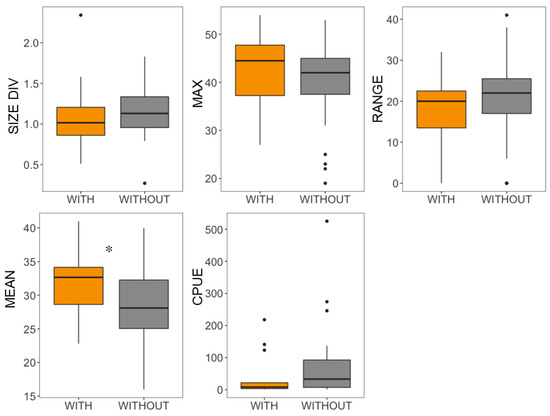 Boxplots showing the distribution of Aphanius iberus capture per unit of effort (CPUE) and size-related variables according to the presence (“with Gambusia”) or absence (“without Gambusia”) of Gambusia holbrooki. Significant differences are marked with the asterisk symbol (*).