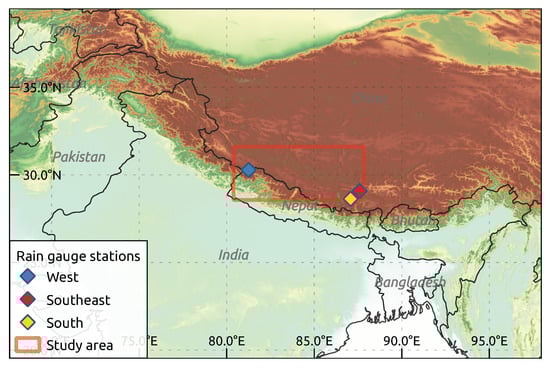 The study area encompasses parts of the TiP, the Himalayas and the Himalaya foothills (Figure 1). It stretches from 81° E to 88° E and from 28° N to 32° N (about 230,000 km2). We chose this study area to include different topographic features, and to represent the transition from the central parts of the Himalayas to the Tibetan Plateau and the Transhimalaya. From southwest to northeast, the first part represents the low-lying southern slopes of the Himalaya, followed by the extreme relief of the Himalayas, and the less complex TiP terrain. The study period was set from May to September 2017, which is the first year in which PRETIP precipitation can be considered. Further, the period covers a full Indian Summer Monsoon season, which exhibits the most interesting features in precipitation for any kind of research application in the study area. The 2017 monsoon season was also unobtrusive in the amount and length of the monsoon precipitation, making it a suitable study period. The choice of the study area was further motivated in the course of follow-up research by Kropáček et al. [34] dealing with glacier lake outburst floods in the Limi Valley originating from the small Halji glacier in northwestern Nepal, which is located within the boundaries of the present study area (close to the west-station in Figure 1).