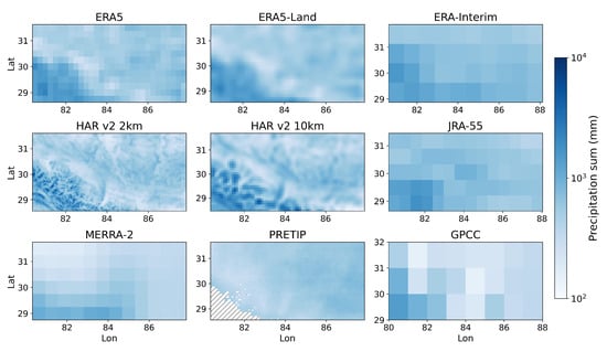 Spatial log-scaled per-grid-cell sum over the study period for each of the precipitation products. Sums were only calculated for valid values, which excluded the south-western corner in the PRETIP product (hatched area) and individual grid cells lower than 2500 m.a.s.l.