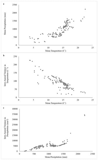 Relationship between historical climate variables in the dataset. (a) Annual average temperature and precipitation levels for each wastewater treatment plant in the sample; (b) Annual average temperature levels and intra-annual variation in temperature for each wastewater treatment plant in the sample; (c) Annual average precipitation levels and intra-annual variation in precipitation for each wastewater treatment plant in the sample.