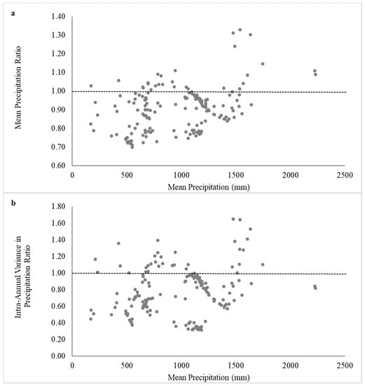 Temporal variation in climate (precipitation) variables in the sample. (a) Ratio between observed and historical annual average precipitation levels for each wastewater treatment plant with respect to historical annual average precipitation levels; (b) Ratio between observed and historical intra-annual variation in precipitation for each wastewater treatment plant with respect to historical intra-annual variation in precipitation.