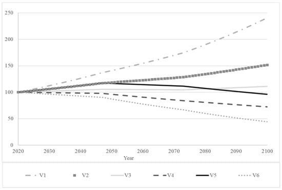Future trajectories of wastewater flows (index, 2020 = 100). Labels V1 through V6 refer to different trends of predicted wastewater flows.