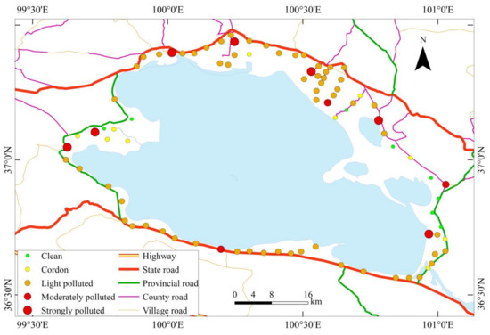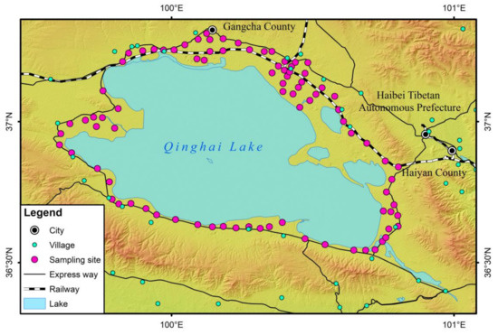 The region around Qinghai Lake discussed in this study refers to the area covering G109, G315, East Lake Road and West Lake Road around Qinghai Lake, where the terrain is flat, soil is fertile and enjoys vast natural pasture. In addition, the lake area enjoys convenient transportation, with a considerable number of highways and various rough roads accessible to each village and town. In view of the large population density and high intensity of human activities in the region around Qinghai Lake, it is also the core area of the Qinghai Lake Natural Reserve (Figure 1). Therefore, it is of particular importance to carry out pollution evaluation and risk assessment on the heavy metals in the surface soil of the region around Qinghai Lake. In the northern part of the study area, the land use types are mainly dry farmland, grassland and a small amount of shrubbery, while those are mainly grassland, desert land and a small amount of dry farmland in the eastern part. However, in the southern and western parts, grassland is dominant.