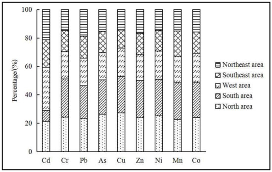 Among those carcinogenic risks, the carcinogenic health risk index of Ni and Co in the surface soil of the study area is generally lower than 1.0 × 10−6, belonging to a noncarcinogenic risk. The carcinogenic health risk index of Cd, Cr and As ranges from 1.0 × 10−6 to 1.0 × 10−4, and the carcinogenic risk is acceptable. The pathways of exposing adults and children to different carcinogenic risks are oral intake > skin contact > inhalation through the respiratory system in descending order by exposure dose, and the contribution rate of oral intake to carcinogenic health risks reaches up to 93.68%. It should be noted that, in the carcinogenic health risk evaluation, Cd, Cr and As have a carcinogenic risk slope factor in three exposure pathways, while Ni and Co have a carcinogenic risk slope factor only in the exposure pathway of inhalation through the respiratory system, and their carcinogenic risks may be underestimated.