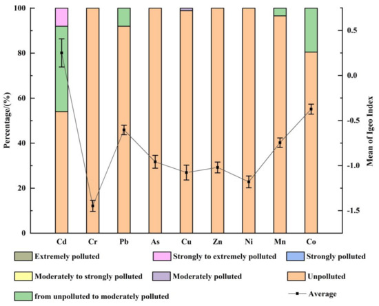 The pollution of heavy metals in the surface soil of the region around Qinghai Lake is Cd (0.25) > Co (−0.37) > Pb (−0.60) > Mn (−0.75) > As (−0.96) > Zn (−1.02) > Cu (−1.08) > Ni (−1.18) > Cr (−1.45) (as shown in Figure 3). In the region around Qinghai Lake, the surface soil is mainly polluted by the heavy metal Cd, the overall pollution level is mild and 37.93% and 8.05% of the sampling points are subject to no pollution–moderate pollution and to severe–extreme pollution, respectively. In addition, the other eight heavy metals are not found to have pollution on the whole. However, some sampling points are subject to no pollution–moderation pollution by heavy metals except Cr, and one sampling point is subject to moderate pollution by Cu.