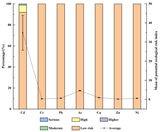 Given the accuracy and universality of the results of Hakanson potential ecological risk evaluation, the classification standard for the ecological risk of heavy metals in the soil is adjusted in this study by the toxicity and types of heavy metals [22]. The specific method is as follows: Er and risk index (RI) grades of the Hakanson method are determined based on the maximum toxic factor of 8 heavy metals and the sum of the toxic factors of 8 heavy metals [23]. Firstly, the grading value of the unit toxic factor is determined as RI = 150/133 = 1.13, where 150 refers to the threshold value of Grade I according to Hakanson, and 133 refers to the total toxic factor of 8 pollutants. In this study, Cd (30) has the maximum toxic factor, and the sum of the toxic factors of 9 heavy metals is 64, so the threshold value of Grade I after adjustment is RIi = 64 × 1.13 ≈ 72, and the threshold value of every remaining grade is twice that of the previous grade [24]. In addition, the values of Er and RI after adjustment are shown in Table 3.