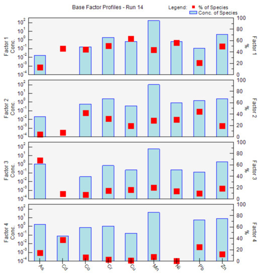 The PMF model is used to analyze the sources of heavy metals and explore the main sources of pollution. According to the signal-to-noise ratio (S/N), As, Cd, Co, Cr, Cu, Mn, Ni, Pb and Zn are set as strong, strong, strong, strong, weak, weak, strong, strong and strong, respectively. The number of factors is set to 2, 3, 4 and 5, respectively, and the number of operations is set to 20. After the trial calculation, when the number of factors is four, the difference between the objective function Q and theoretical value Q in the software operation results is the smallest; that is, the heavy metals in the soil of the study area are determined from six main sources. In addition, in order to ensure the accuracy of the model, extreme data samples will be eliminated.