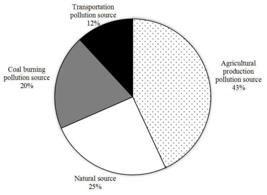 The results of the PMF source analysis show that agricultural production sources contribute for 43.10%, natural sources contribute for 25.34%, coal-burning sources contribute for 19.67% and transportation sources contribute for 11.89%, respectively (as shown in Figure 7).