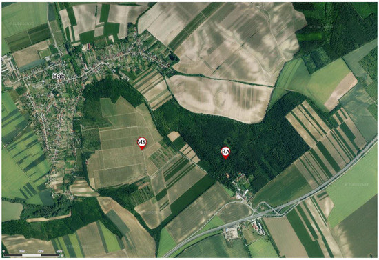 Figure 1. The localization of the Báb research area (RA) and meteorological station (MS) where the meteorological data were derived. The coordinates for the RA are 17.886, 48.3033, with an average elevation of 190 m a.s.l. (minimum of 170 m a.s.l, maximum of 210 m a.s.l.). The coordinates for the MS are 17.87881, 48.30331, with an elevation of 207 m a.s.l. The data were obtained from the DEIMS-SDR (Dynamic Ecological Information Management System-Site and dataset registry) database [25].