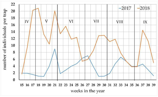 In 2017, Carabus species activity remained low until first ten days of May (Figure 2). Then, the activity raised gradually, reaching a peak by the end of May, followed by a sudden decline in activity in the beginning of June (22nd week). The early summer activity period reached a peak in the beginning of July. After the summer stagnation, Carabids performed late summer–early autumn activity period with the peak of activity recorded in the middle of August.
