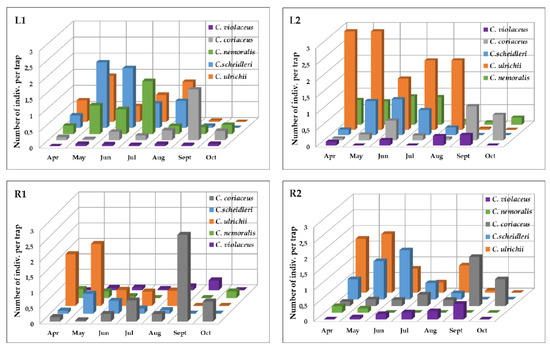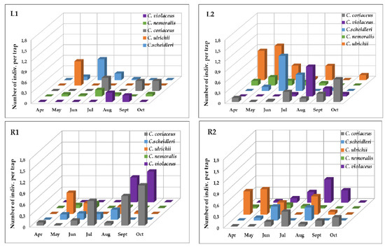 In 2017, the carabid activity through April and May was mostly influenced by the activity of C. ulrichii at all study plots (Figure 3). The peak of activity recorded by the end of May was almost exclusively influenced by this species. C. scheidleri started to activate from the second half of May, and the activity culmination at the turn of June to July was considerably influenced by this species, especially for both forest study plots (Figure 3); however, few individuals of the species C. coriaceus were recorded in April at L2 and R1. The species started its main activity at the end of June, where the maximum activity was recorded during the beginning of July. During the same period, the activity of C. nemoralis peaked at both forest stands (Figure 3). From the second half of July to the first half of August, summer activity stagnation was observed at all research plots. C. violaceus started to activate at the turn of July to August and considerably contributed to activity during middle to late August. The activities of C. ulrichii and C. scheidleri at the two forest recovering stands also significantly contributed to the August activity culmination. The autumn activity period was characterized by C. coriaceus and C. violaceus activity (Figure 3).
