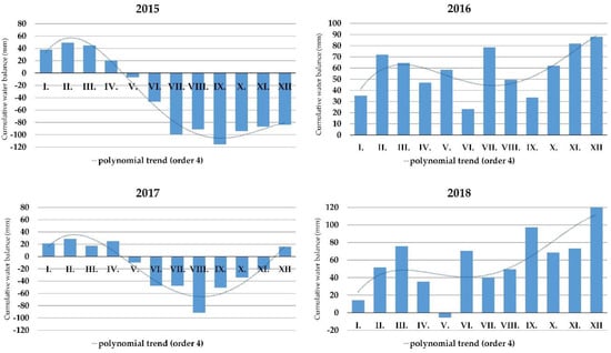 Figure 5. The cumulative water balance for the locality of Báb (southwestern Slovakia) in 2015, 2016, 2017 and 2018.