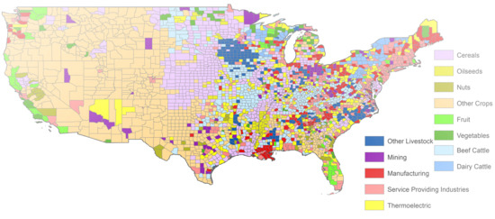 The United States is a major economic producer, consumer, and trade power. The economy and supply chains of the US rely on water resources [4]. The US is a key nation in the global virtual water trade network [5], contributing the most virtual water to global trade [3]. International virtual water trade with the US is enabled by a host of interconnected infrastructure [6]. The spatial distribution of water security within the US influences where water-intensive goods are produced. Water hazards and risk further shape production and disrupt supply chains [7]. In turn, supply chains can shape water resources and influence their sustainability [8]. Water stress varies spatially and across economic sectors in the US [7]. Water footprints identify counties in the US where human water use exceeds renewable water supplies [9,10,11].