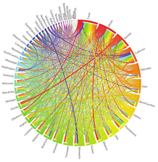 Agricultural virtual water flows between states in the United States. States are ranked according to the total virtual water flow volume and plotted clockwise in descending order. The size of the outer bar indicates the total virtual water flow volume of each state as a percentage of total US virtual water flows. Links emanating from the outer bar of the same color show outflows. Links with a white area separating the outer bar from links of a different color illustrate inflows. The volume of virtual water flows captured in this graph is 317 billion m3 year−1. This figure is taken from Dang et al. [56] and is circa 2007.