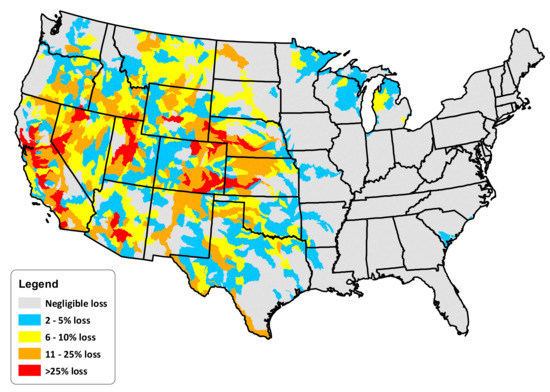Summer streamflow depletion in the Western US due to water footprints of production, specifically those related to irrigated agriculture. Predictive ecological models estimate that some basins will lose over 25% of native fish species due to streamflow depletion caused by large water withdrawals and consumption. This figure is taken from Richter et al. [20] and is for the period 2010–2012.