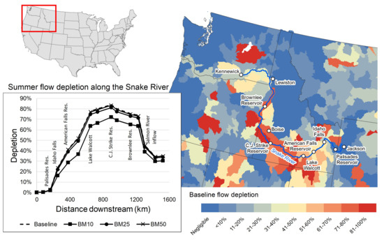 Significant reductions in streamflow depletion in the Snake River watershed can be achieved by moving unproductive water users to their industry-specific water footprint benchmark. The ‘BM’ levels on the graph represent three, Äòtarget benchmark, Äô levels: BM50 = 50th percentile or median performance; BM25 = 25th percentile or high performance; and BM10 = 10th percentile or outstanding performance. Increased river flows in the upper basin due to reduced water footprints would bolster reservoir storage, which is important to farmers and hydroelectric power producers. Increased flows in the lower portion of the watershed would benefit imperiled salmon populations. This figure is taken from Marston et al. [53] and is for the period 2007–2017.
