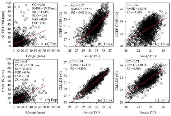 Scatter plots of gauge stations with (a–c) NCEP-CFSR and (d–f) CMADS in daily precipitation (Pcp), daily maximum temperature (Tmax) and daily minimum temperature (Tmin) estimations.