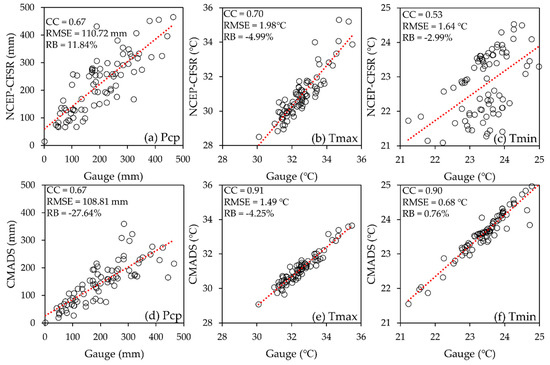 Scatter plots of gauge stations with (a–c) NCEP-CFSR and (d–f) CMADS in monthly precipitation (Pcp), monthly maximum temperature (Tmax) and monthly minimum temperature (Tmin) estimations.